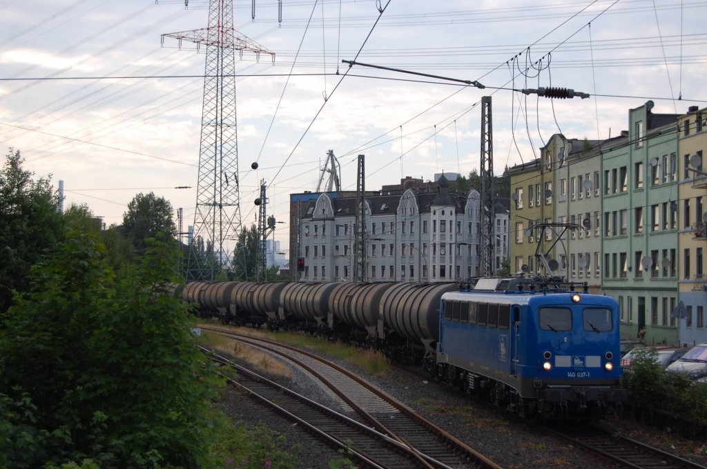 140 037-1 verlässt gerade ihren Startbahnhof Hamburg-Unterelbe,zum ziehen hat sie einen Kesselwagenzug der mit Heizöl befüllt nach Bad Reichenhall geht.