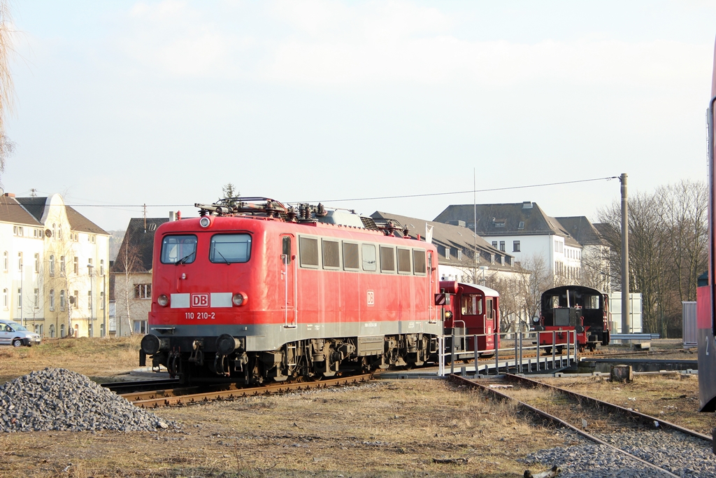 DB 110 210-2 wird von der Köf 6782/323 852-4 auf die Drehscheibe gezogen. Im Hintergrund steht die Kö 0278/311 278-6 in Koblenz-Lützel am 25.2.2012