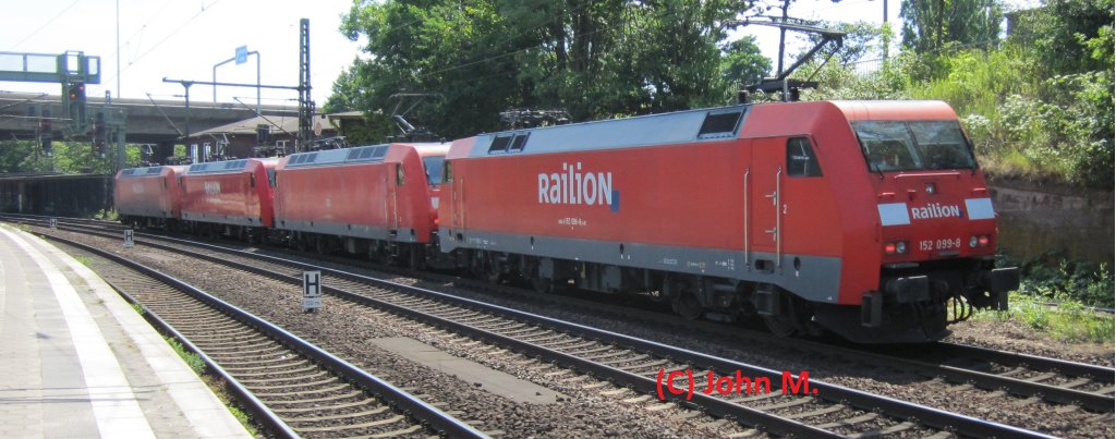 Im Sommer 2010 fuhr die 4er Traktion 152er durch den Bahnhof Hamburg Harburg. (zum Bild)